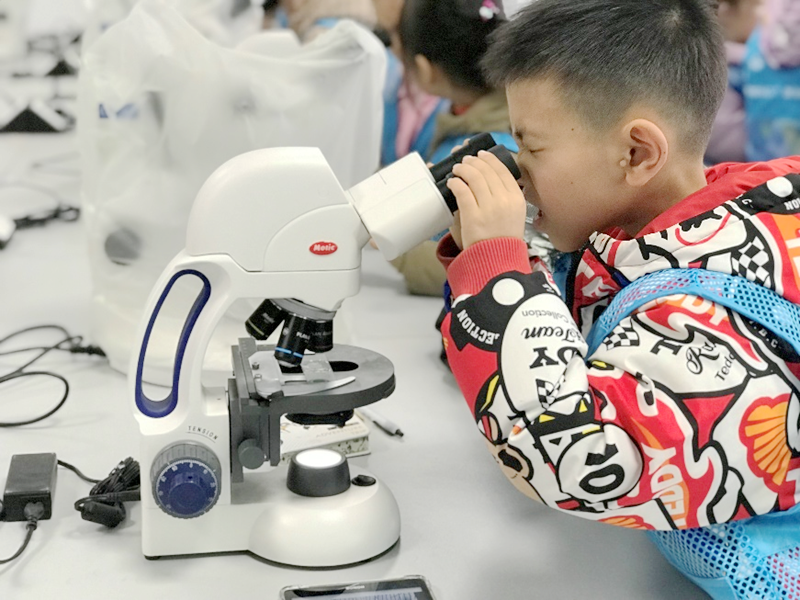 接着小记者们到实验室进行简单的洋葱内表皮细胞临时装片制作观察实验。小记者们2人为一小组,先由杨雪老师讲解学习,随后各小组小记者进行实验操作。装片制作完成后,小记者们来到显微观察室,在覃晓洁老师的介绍下了解了显微镜的基本结构及使用方法,并对自己制作的装片进行观察。