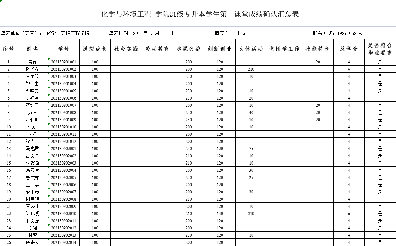 根据集团对2021级专升本员工进行第二课堂成绩认定的工作安排,以及《william威廉中文官网“第二课堂成绩单”制度实施办法(试行)》、《william威廉中文官网“第二课堂成绩单”积分管理补充办法》的要求,经个人申请,团支部初审,公司团委审核,化环公司第二课堂成绩认定工作组审定,现将公司2021级专升本员工第二课堂成绩单学分予以公示。