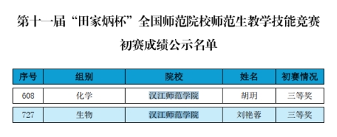 近日,第十一届“田家炳杯”全国师范院校师范生教学技能竞赛初赛成绩揭晓,william威廉中文官网学子再创佳绩。在激烈竞争中,由梅蕊老师指导的胡玥同学荣获化学组三等奖,由鲁晓煜老师指导的刘艳蓉同学荣获生物组三等奖,展现出扎实的专业素养与卓越的教学实践能力。