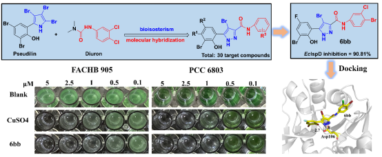 图2. 目标化合物的合成路线,与EcIspD蛋白分子对接示意图以及对蓝藻的抑制效果图